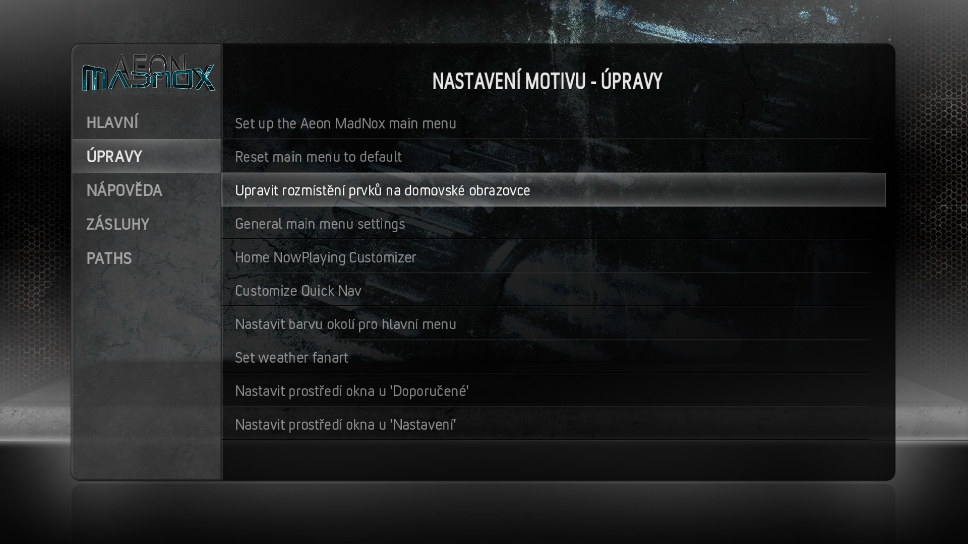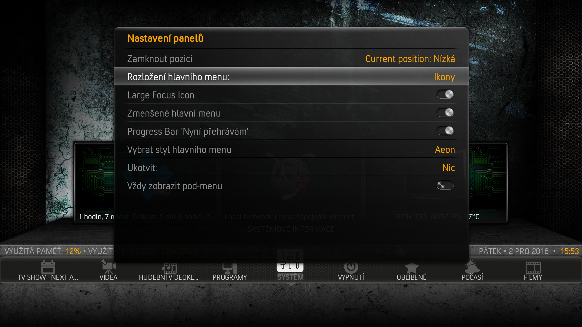 RE: Aeon Madnox RC2 (Jarvis) - CZMiki - 01.12.2016 Ahoj, poradí někdo kde nastavit zobrazování ikon v hlavním menu (filmy, počasí...), jako to má Rossi D na obrázcích? RE: Aeon Madnox RC2 (Jarvis) - PepikBerry - 02.12.2016 Pro počasí, musíš mít nainstalovaný nějaký doplněk na počasí. A pro filmy, musiš mít navolenou cestu ke složce s filmy na pc. RE: Aeon Madnox RC2 (Jarvis) - CZMiki - 02.12.2016 To jsme se nepochopili :) Jde mi čistě o ty ikony ve vzhledu, aby tam nebyl jen nápis film, tv seriál, počasí..., ale i ikona, jako má třeba hned na prvním obrázku RE: Aeon Madnox RC2 (Jarvis) - PepikBerry - 02.12.2016 Aha, promiň. Myslel jsem, že tam nemáš vůbec počasí a filmy. V tom případě neporadím, asi to bude záležitost skinu a nastavení - nevím, tenhle skin nepoužívám, na malinu je pomalý. RE: Aeon Madnox RC2 (Jarvis) - Rossi D - 02.12.2016 Jednoduché, na nasvíceném "bloku" který chceš upravovat, zmáčkni "enter" a zvol jako rozložení hlavního menu "ikony" RE: Aeon Madnox RC2 (Jarvis) - optimas - 06.12.2016 Nainstaloval jsem si tenhle skin, ale nic se neprojevilo ani ho nemám v System - Vzhled. Něco proběhlo vpravém dolním rohu, ale jinak nic. Zkoušel jsem to znovu a pořád nic. RE: Aeon Madnox RC2 (Jarvis) - Rossi D - 06.12.2016 Instalace a nastavení tohoto skinu nepatří mezi jednoduché činnosti, pokud s Kodi začínáš rozhodně jej nedoporučuji. Je zapotřebí nejdříve vše nastudovat, důležité odkazy jsem dával zde → Potřebné odkazy RE: Aeon Madnox RC2 (Jarvis) - CZMiki - 07.12.2016 Rossi, opožděně děkuji za radu ;-) S Madnoxem si ještě hraju na PC, ale jelikož hlavní přehrávač bude na RPI3, tak jsem byl nucen přejít na úspornější skin. Nakonec jsem po zkušenosti z Madnoxu hledal nějaký podobný, který by zároveň uměl i animované postery. Vyhovujících je bohužel zoufale málo, ale nakonec jsem se vzhlédl v Aeon MQ7. Jako alternativu vřele doporučuji. RE: Aeon Madnox RC2 (Jarvis) - Rossi D - 07.12.2016 Tak na RPi je Madnox opravdu silná káva (HTPC - tam je jako doma)... Pro malinu mám jako alternativu velice podobný (tuším, že tvůrce spolupracuje i na vývoji Madnox skinu), nenáročný → Aeon Nox 5: SiLVO , taktéž doporučuji !