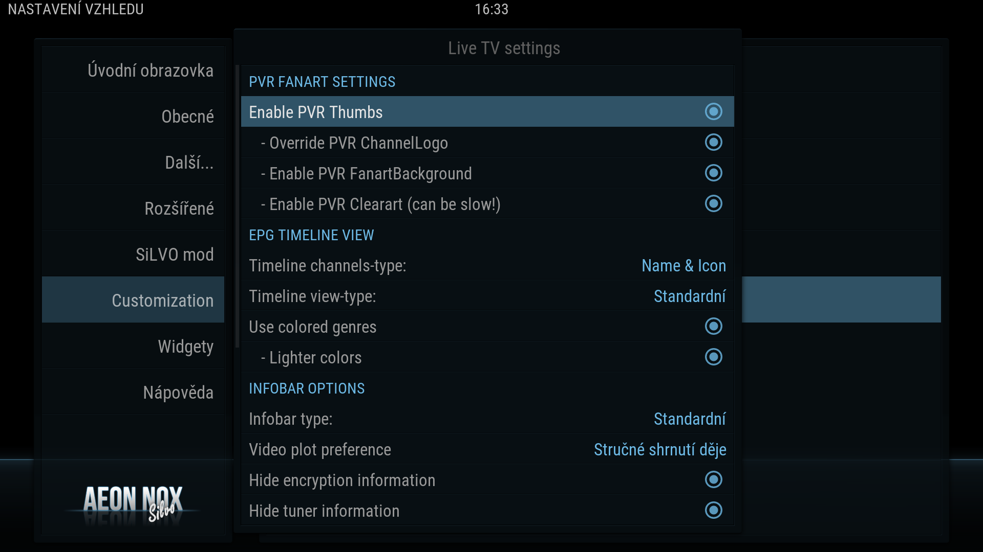 trosku jsem si pohral s timto skinem,pro obrazky jsem pouzil toto(AeonNox 5 SiLVO (Krypton) to use skinhelper to scrape Artwork-na strance http://forum.kodi.tv/showthread.php?tid=291830)a na zvetseni loga,hodin a upraveni channel name+vymaz cisla jsem upravil toto-Includes_LiveTV a vysledek je: