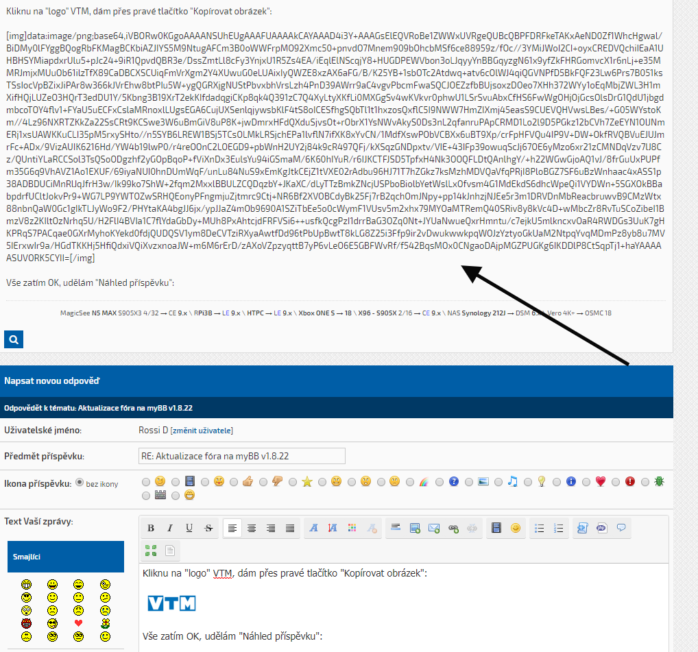 Tak "logo" jsem vyřešil pomocí "Kopírovat adresu obrázku" a následného vložení přes "Vložit obrázek", takto oklikou je to OK, jednoduchý a hlavně rychlý proces copy/paste v této verzi nefunguje (jak je psáno výše, jedná se zřejmě o chybu myBB 1.8.22).Možná s tím bude spjato i ono nevyzpytatelné chování editoru a jeho "nahodilé" formátování textu (přeskupí mi text zarovnaný doprava zpět na střed či nerespektuje vložení prázdné řádky), docela se spolu u této činnosti hádáme. 11