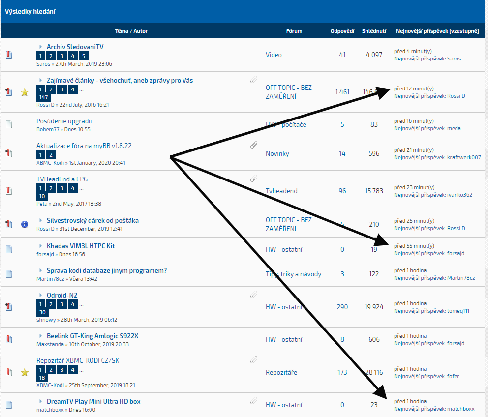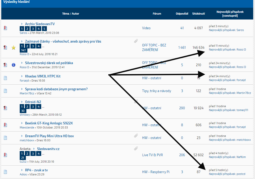 Stran zobrazování "přečteného", dole je screen aktuálně přečteného fóra a toto se objeví při vyhledávání (dokonce je uveden i můj aktuální příspěvek):