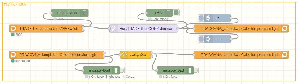 No tak jsem to udelal pekne pod sebou - oddelil jsem tlacitko, ktere komunikuje primo se svetlem a potom jsem si udelal vystupni node se stavem zarovky a do Homekitu a dale vstupni z Homekitu a vyuzil toho, ze uz to vse vymyslel autor pluginu. No a vse funguje tak, jak ma. Dokonce kdyz drzim tlacitko Ikea pro zesileni/zeslabeni, tak stejne jako se zesiluje/zeslabuje lampicka mi jede ukazatel nahoru/dolu v Homekitu. Tak co vic si prat? Snad jen to, ze nekdy je zbytecne, kdyz clovek premysli az zbytecne moc