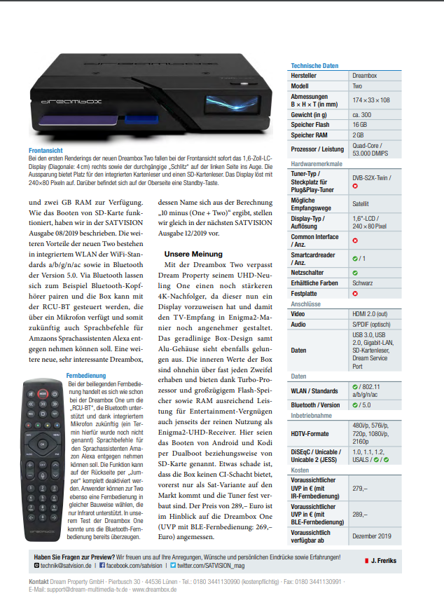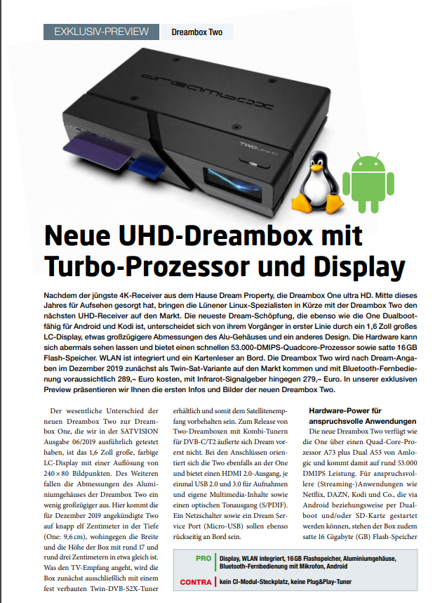 Po Dreambox One ultra HD, který způsobil rozruch v polovině roku díky rychlému hardwaru, společnost Dream Property oznámila pro tento rok další Dreambox s podporou 4K. Toto je Dreambox Two, který opět boduje turbo procesorem a více než 53 000 DMIPS a tentokrát je vybaven barevnou obrazovkou. Kromě toho bylo upraveno hliníkové pouzdro přijímače Enigma2. Díky dálkovému ovládání Bluetooth lze box umístit i do skříně a oznámená podpora jazykového asistenta Alexa by měla umožnit ovládání hlasem. Kromě Enigma2, včetně obrazu a četných pluginů, může být alternativním softwarem, jako jsou Android a Kodi, pro streamování aplikací, jako jsou Netflix a DAZN a doplňky Kodi, jako je u One, například bootovat pomocí SD karty . Na Linuxovém základě se dvěma DVB-S2X tunery, integrovanou WLAN a HDR podporou by měl být dostupný v prosinci 2019 ?? s cenou kolem 290, -€.