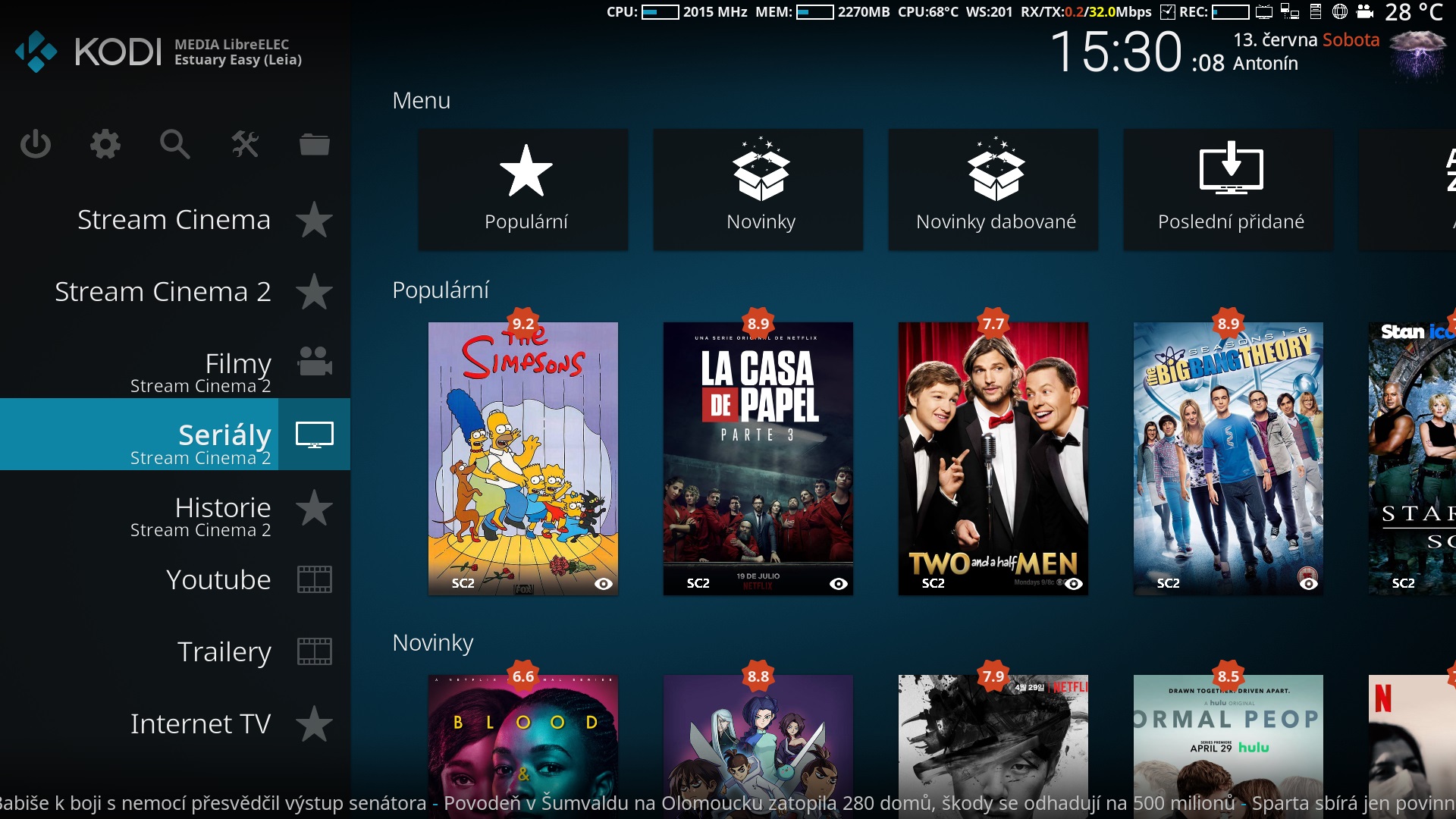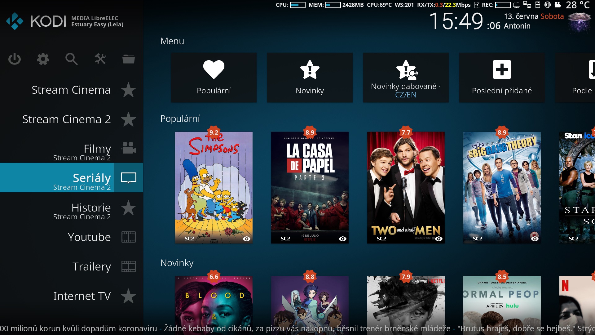 - Cinema - základní funnkce podporující addons Steram-Cinama, jak ten původní, tak jeho "dvojku". Prakticky nulová parametrizace, po instalci a převzetí parametrů z Estuary Stream-Cinema funguje okamžitě, pokudu nastavení původního skinu nepřeberete, je možné na jedno tlačítko nastavit skin do předdefinovaného optimálního výběru funkcí (pro babičky a dědečky