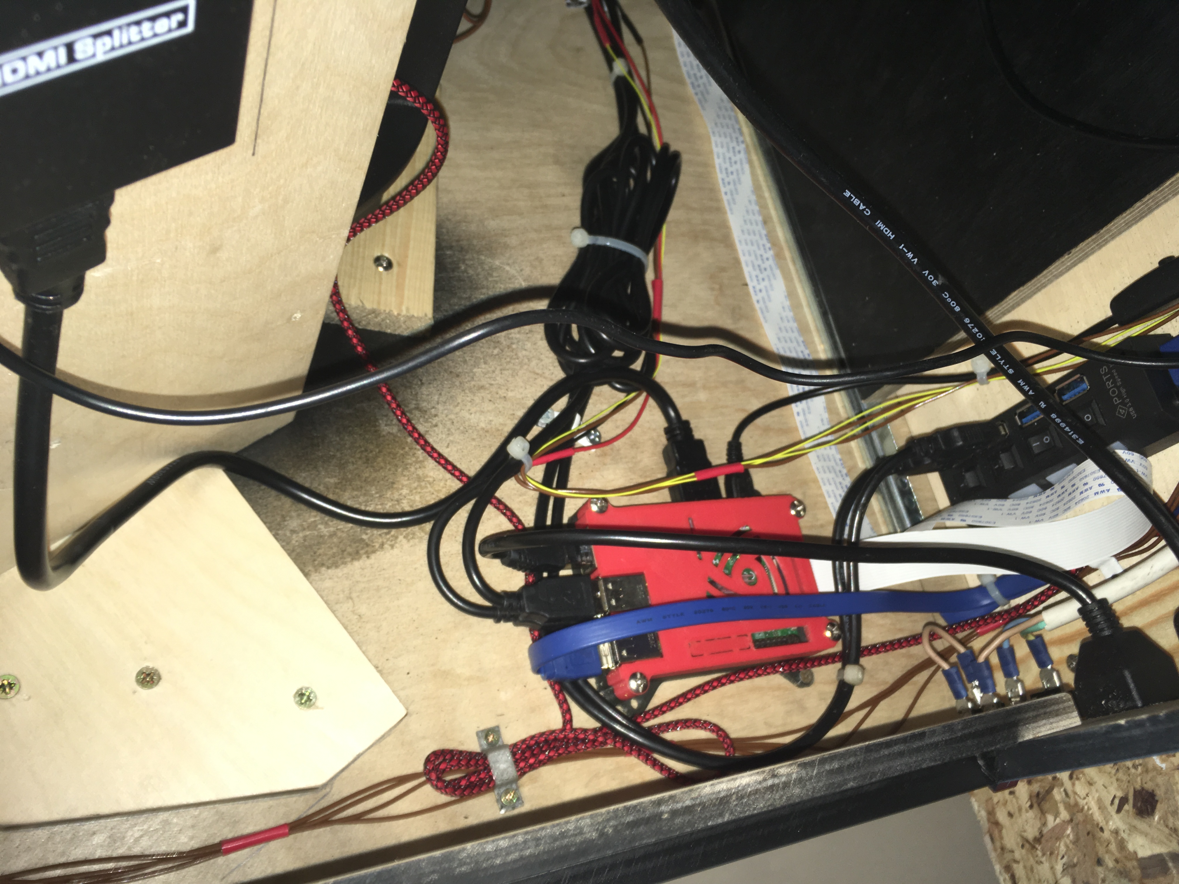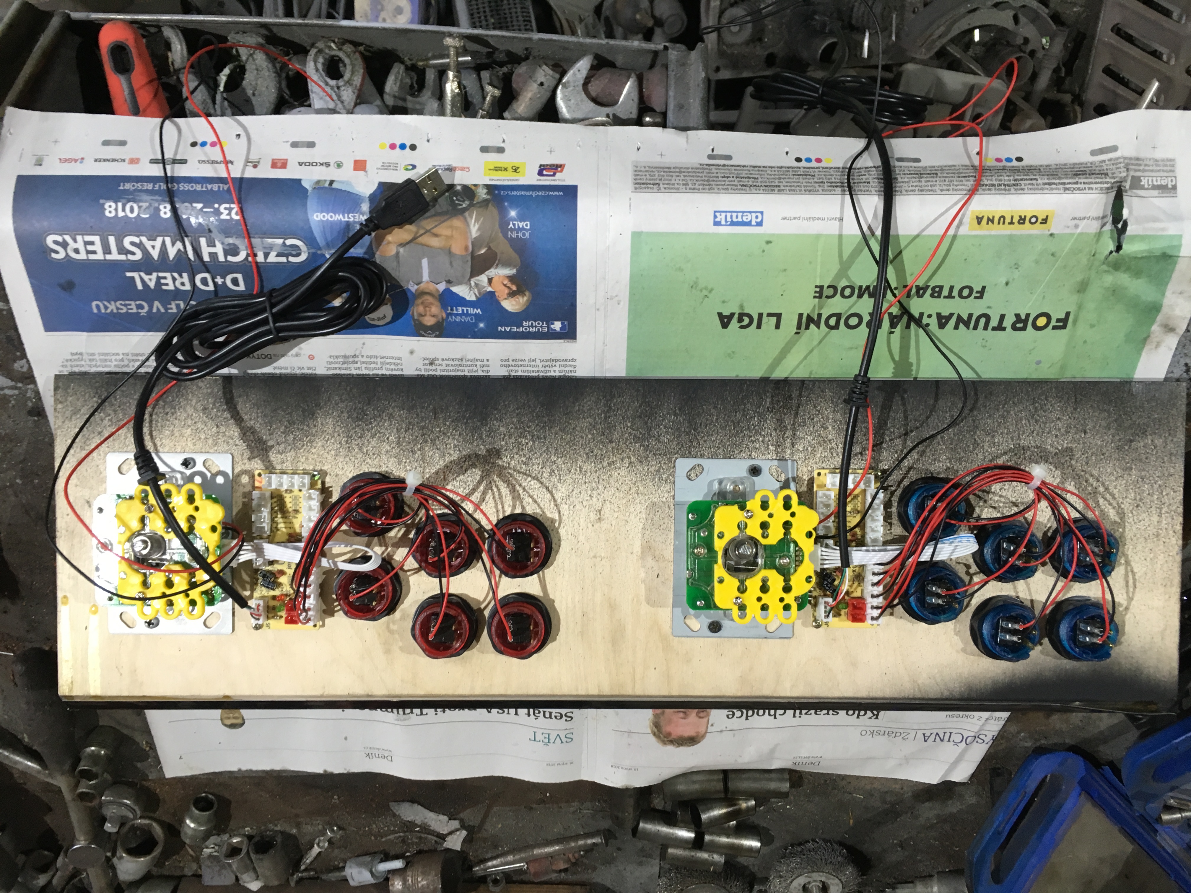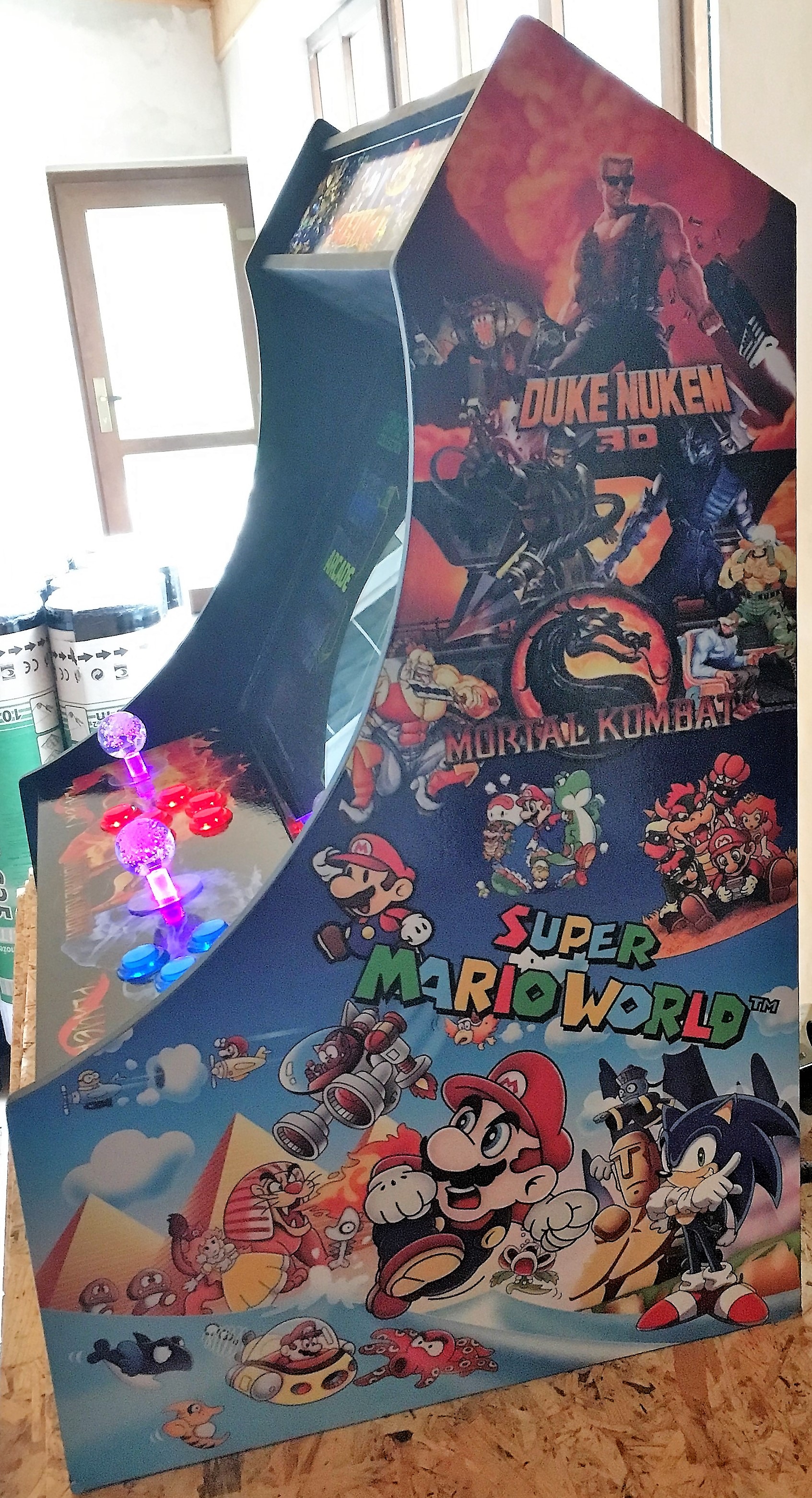 Protože mám rád hry a jsem retro pozitivní dostal jsem chuť postavit si svůj vlastní arcade automat. Jelikož automat bude ve společenské místnosti, pojal jsem celý koncept jako multimediální centrum které bude moct být připojené např. na projektor a schopné přehrávat filmy z Kodi. Začal jsem tedy hledat možnosti jak to všechno dát dohromady. Našel jsem si na internetu nějaké plány které nevypadaly úplně tak jak jsem si představoval ale dalo se z nich vycházet. Kamarádovi který je truhlář jsem nastínil mojí představu a všechny díly mi uřízl z cca 1cm tlusté překližky. Poté co mi dorazily všechny potřebné díly jsem se konečně mohl pustit do stavby. Nejdříve jsem všechny dřevěné díly obrousil, nastříkal načerno a hodil přes to lak. Pak jsem začal dávat dohromady ovládací panel s tlačítky a joysticky, pozapojoval všechny kabely a poté to celé sešrouboval dohromady. Koupil jsem 24" širokoúhlý monitor s VESA uchycením a přes něj jsem ještě dal krycí bezpečnostní sklo které jsem si nechal uříznout u sklenáře. Na vrchní podsvětlenou markízu je použito matné plexisklo a býlí LED pásek. Celé to samozřejmě pohání Raspberry 3B ale nevylučuji, že ho časem nevyměním za něco výkonějšího 3B+ nebo Odroid XU4. Dovnitř nad monitor jsem zabudoval dva reproduktory které jsou napojeny na zesilovač napájený 12V adaptérem. Přidal jsem tam ještě 4 portový aktivní USB hub protože 4 USB které jsou na raspberry byly pro mě nedostatečné vzhledem k tomu že jsou tam zapojené 2 joysticky, 2 USB vyvedené na přední panel (možnost hrát ve 4 hráčích) a klávesnice která bude dole v šuplíku. Uvnitř je ještě zapojen aktivní 2 portový HDMI splitter aby zajistil případné zobrazení na projektoru. Na zadní stěnu je vyvedený napájecí, LAN a HDMI konektor právě pro připojení projektoru. Na celý automat jsem si pak ještě nechal udělat polep aby to mělo ten správný retro styl. Automat momentálně obsahuje 64Gb image která má 3400 her ale v záloze mám ještě nějaké co mají 128Gb pro případ že by se mi někdy v budoucnu podařilo všechny hry dohrát.