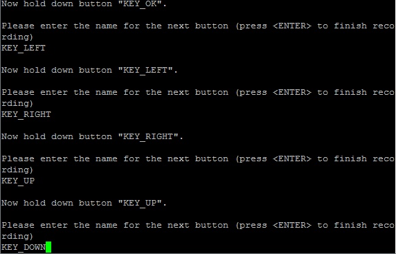 Pak už jen zadáte název tlačítka (funkci) např. KEY_DOWN a stiskněte tlačítko na ovladači (šipka dolů), takto postupujete do té doby než pojmenujete všechny potřebná tlačítka.