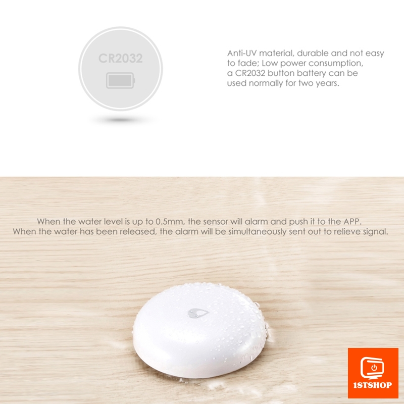 Aqara Water Leak Sensor - SJCGQ11LM: detekce vody, pri zaplaveni cidla do vysky 0,5mm spusti predem definovanou akci (poplach na gateway, notifikace, rozsviti svetlo,...)